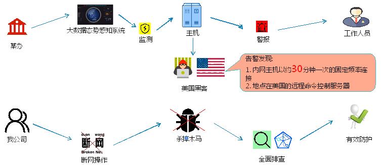政府网站通常包含有大量的公民信息,因此是国内外黑客的主要攻击对象。某区政府通过大数据安全态势感知平台的告警模块监测到,内网主机以约30分钟一次的固定频率连接地点在美国的远程命令控制服务器。通过对该内网主机实施断网隔离,进一步由安全专家人工安全检查分析,找到了系统后台存活的木马进程,为防止木马程序在内网其他主机上的潜伏,对内网主机进行了全面排查。