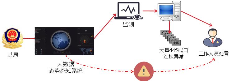 某公安分局通过大数据安全态势感知平台的可视化数据,发现内网2台主机发起大量445端口连接,立即采取断网隔离操作,其中一台未按要求处理,导致第二天发现了更多的445端口连接,同时了解到“勒索病毒”爆发,马上对 被感染的机器采取强制隔离指令,之后未发现新的感染情况,此次良好处置得到某局上级的高度表扬。