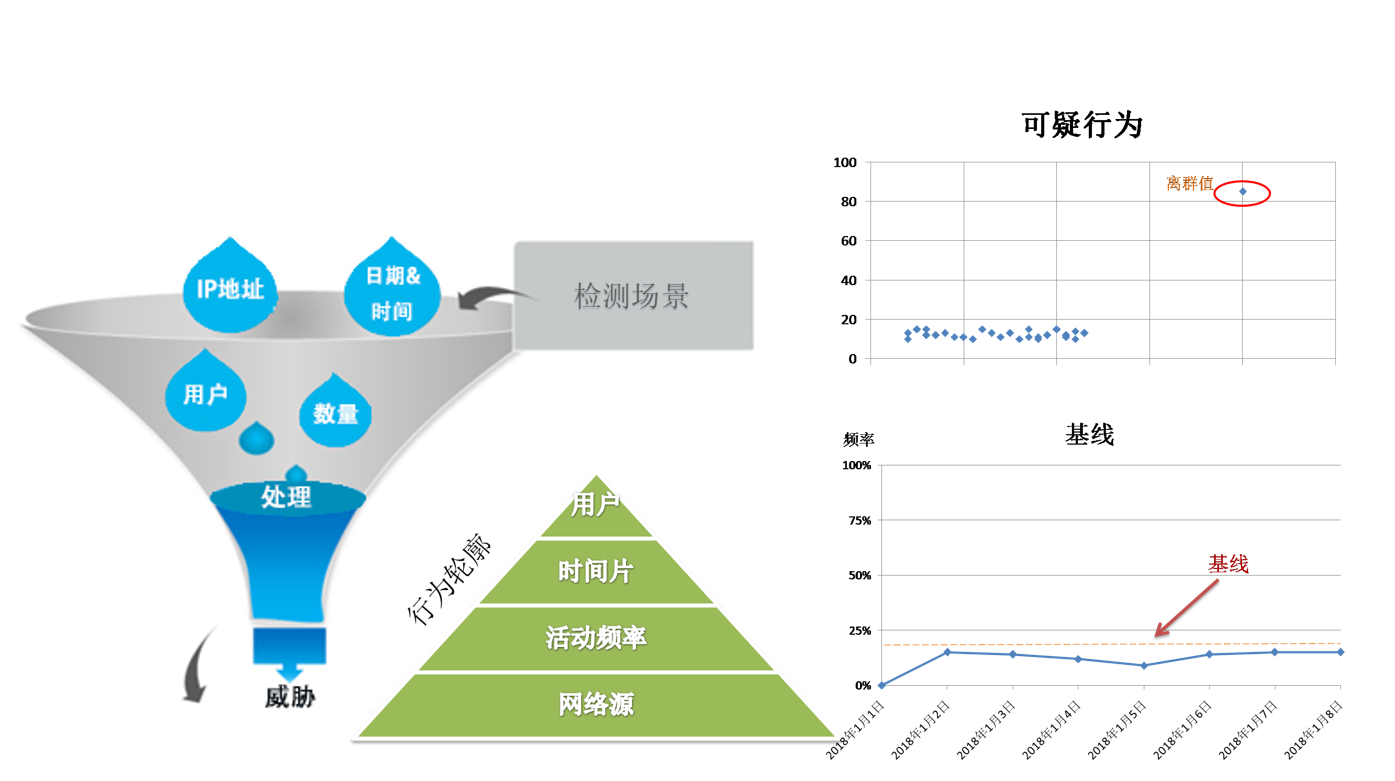 基于机器学习,进行长周期计算,建立多维度行为基线,依据基线发现异常行为。